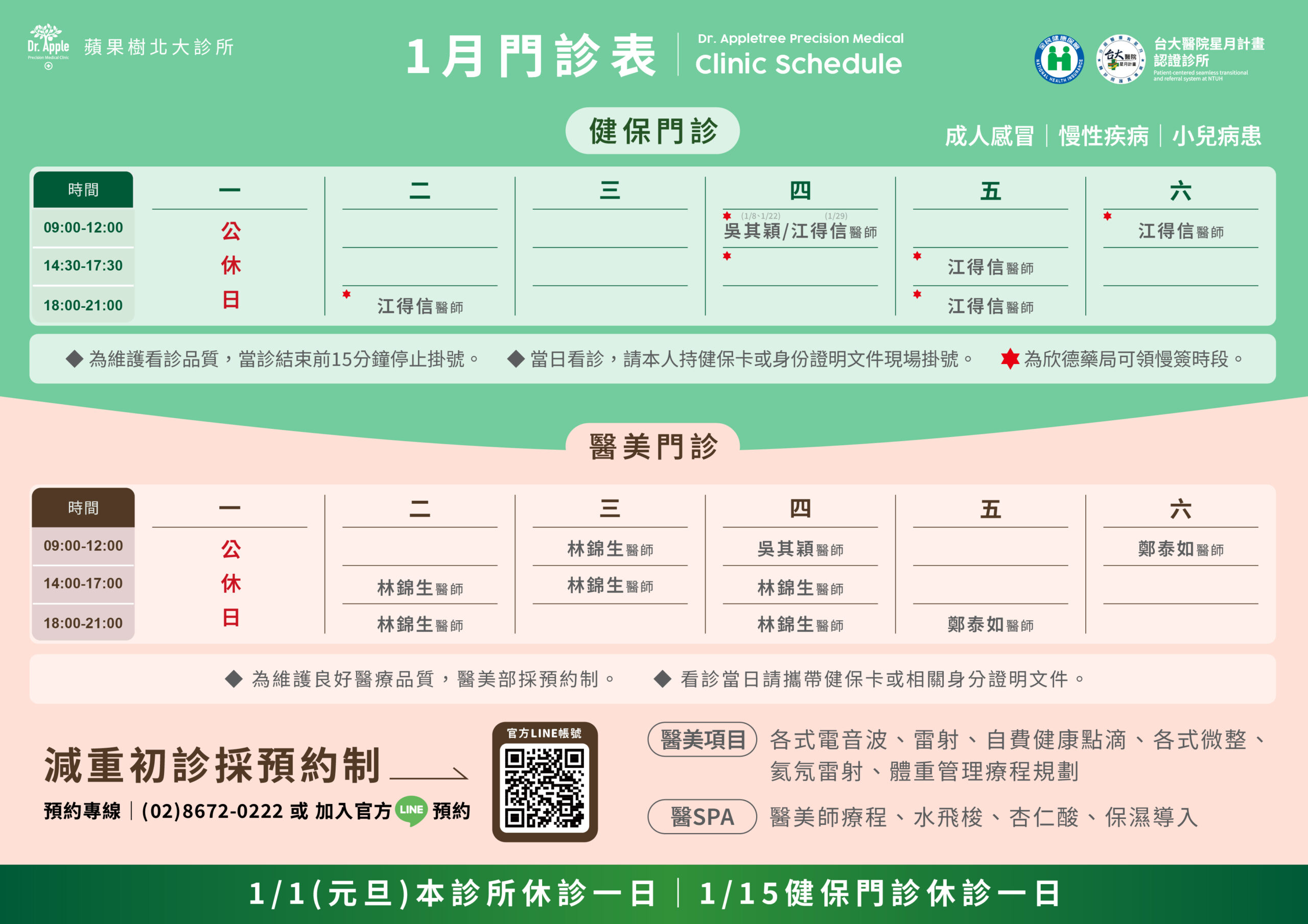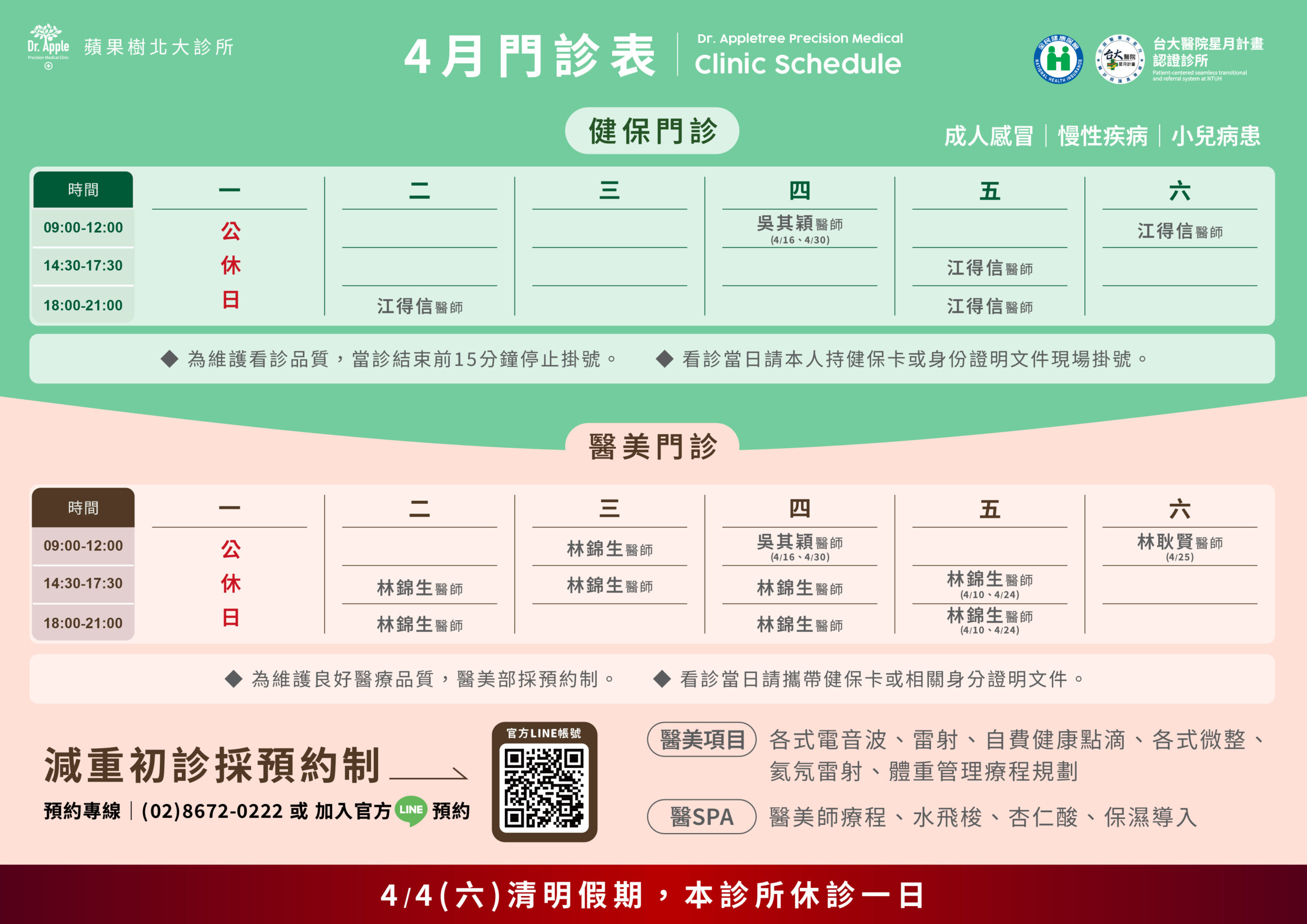 這是一間為了落實美而設立的健保診所。經營純自費整體醫學精準治療醫美10年的經驗,一直深感整體的美必須是有健康的身體和完整家庭才能實踐的!因此唯有落實健康概念在每日生活才能擁有真正的美!蘋果樹北大診所就是為了這個理念而誕生的!我們希望帶給大家一個全台灣最美的健保診所!讓更多人可以加入美的精準醫學健康概念!