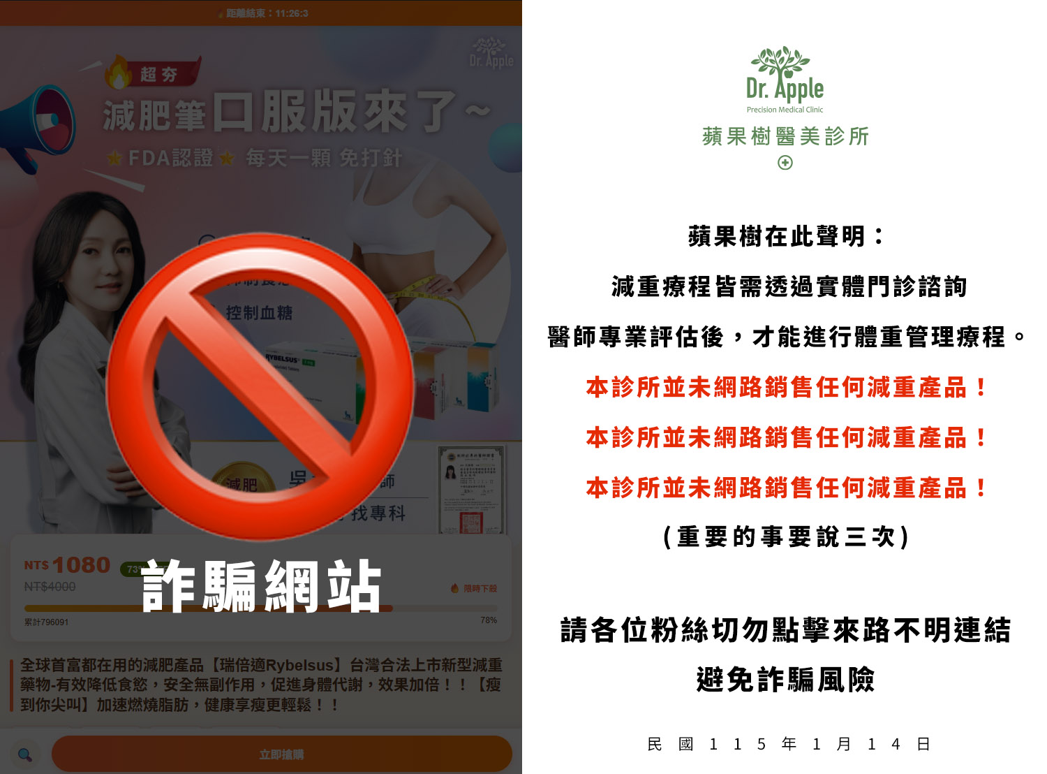 發現非本診所授權之網站/平台,疑似擅自使用本診所 LOGO 及醫師相關圖文,進行減重商品之販售行為。
